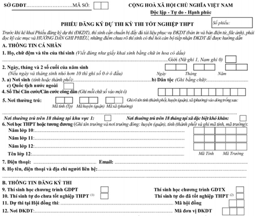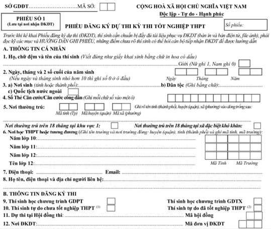 Mục 1, 2: Ghi theo hướng dẫn trên Phiếu đăng ký dự thi kỳ thi tốt nghiệp THPT (sau đây gọi tắt là Phiếu ĐKDT).