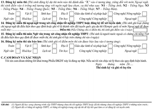 Mục 14: Đối với thí sinh có nguyện vọng miễn thi môn Ngoại ngữ, cần ghi rõ loại chứng chỉ đủ điều kiện miễn thi hoặc ghi rõ là thành viên đội tuyển quốc gia dự thi Olympic quốc tế môn Ngoại ngữ theo quy định của Bộ GDĐT Đối với loại chứng chỉ có ghi điểm thi (điểm toàn bài thi), thí sinh phải ghi điểm vào ô “Điểm thi”.