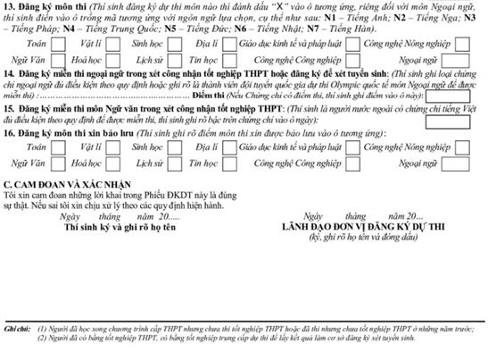 Mục 13: Đối với thí sinh hiện đang là học sinh lớp 12 (chưa tốt nghiệp THPT) phải dự thi Toán, Ngữ văn và 02 môn thi đã được học ở lớp 12 trong số các môn: Vật lí, Hóa học, Sinh học, Lịch sử, Địa lí, Giáo dục kinh tế và pháp luật, Tin học, Công nghệ Công nghiệp, Công nghệ Nông nghiệp, Ngoại ngữ. Trường hợp thí sinh tự do chưa tốt nghiệp THPT có những môn thi (để xét công nhận tốt nghiệp THPT) năm trước đủ điều kiện bảo lưu, nếu muốn bảo lưu môn thi nào thì phải ghi điểm môn thi đó ở Mục 15. Tuy nhiên, thí sinh vẫn có thể chọn thi môn thi (đã đề nghị bảo lưu) để lấy kết quả xét tuyển sinh đại học, cao đẳng.
