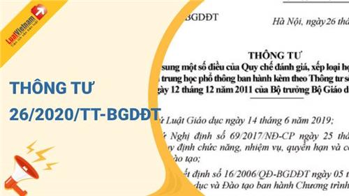 Ngày 26/8/2020, Bộ Giáo dục và Đào tạo đã ban hành Thông tư 26/2020/TT-BGDĐT về việc sửa đổi, bổ sung một số điều của Quy chế đánh giá, xếp loại học sinh trung học cơ sở và học sinh trung học phổ thông ban hành kèm Thông tư 58/2011/TT-BGDĐT ngày 12/12/2011 của Bộ trưởng Bộ Giáo dục và Đào tạo.