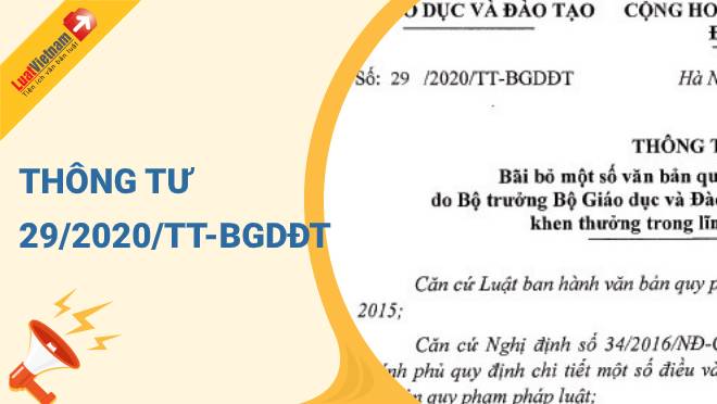 Ngày 15/9/2020, Bộ Giáo dục và Đào tạo ra Thông tư 29/2020/TT-BGDĐT về việc bãi bỏ một số văn bản quy phạm pháp luật do Bộ trưởng Bộ Giáo dục và Đào tạo ban hành về thi đua, khen thưởng trong lĩnh vực giáo dục.
