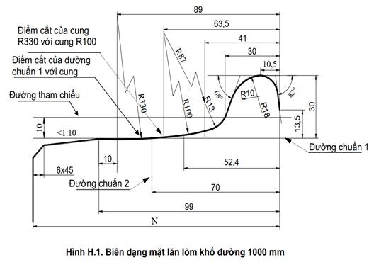 | 15 | Biên dạng mặt lăn, giang cách bánh xe | Quy chuẩn, tiêu chuẩn áp dụng kèm theo bản vẽ thể hiện các kích thước xác định biên dạng mặt lăn, giang cách bánh xe |