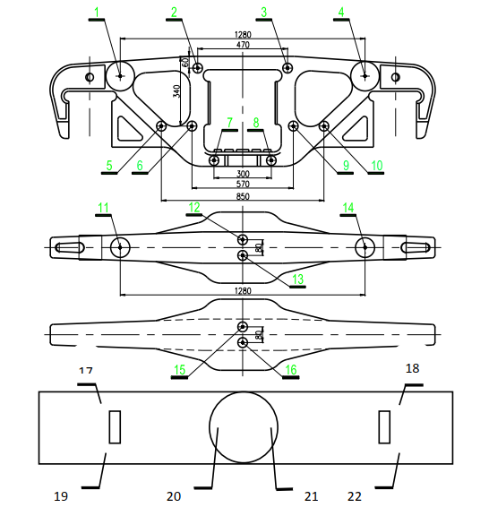 c) Bản vẽ kỹ thuật tổng thể giá chuyển hướng của nhà sản xuất hoặc đơn vị thiết kế. Các bản vẽ kỹ thuật của nhà sản xuất hoặc đơn vị thiết kế gồm: khung giá, má giá, xà nhún, bộ trục bánh xe, hệ thống hãm, hệ thống treo, hệ thống truyền động (mô tơ điện kéo, hộp giảm tốc, thanh truyền, thanh kéo, thanh liên kết của hệ thống truyền động), hệ thống thiết bị lắp trên giá chuyển hướng...