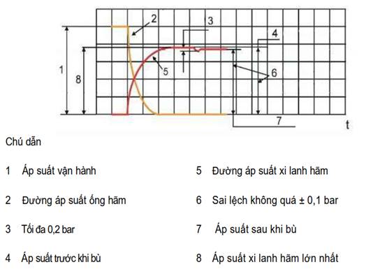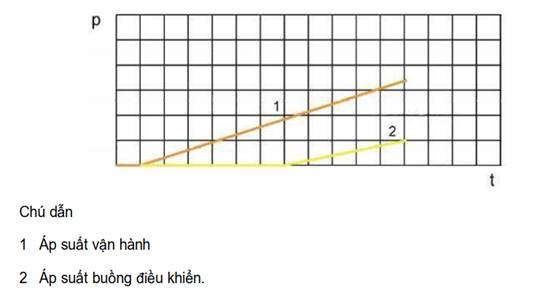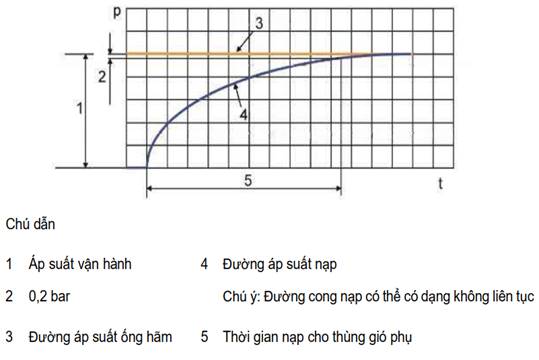 Áp suất nạp cho thùng gió phụ phải tăng từ 0 bar lên đến mức áp suất vận hành. Thời gian nạp từ thời điểm áp suất nạp bắt đầu tăng và khi đạt đến 0,2 bar dưới mức áp suất vận hành phải nằm trong dải từ 50 s đến 135 s (Xem hình A.1). Đồng thời quan sát quá trình nạp gió của buồng điều khiển phải nằm trong dải từ 150 s đến 200 s.
