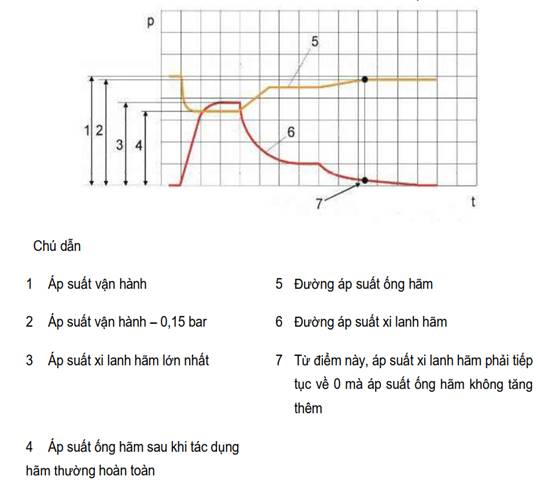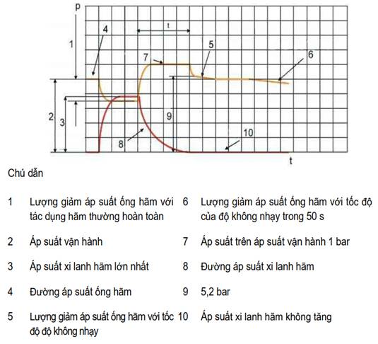Phải ghi lại thời gian nhả hãm cùng với lượng tăng áp suất ống hãm từ 0 bar lên đến áp suất vận hành với tốc độ không nhỏ hơn 2 s cho mức tăng áp suất 1,5 bar cuối cùng.