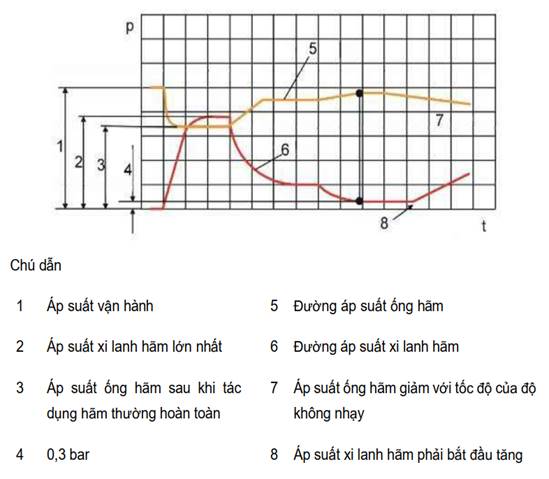 Thời gian tác dụng hãm được đo từ khi bắt đầu tăng áp suất xi lanh hãm lên đến 95 % áp suất xi lanh hãm lớn nhất (làm tròn đến 0,1 bar).