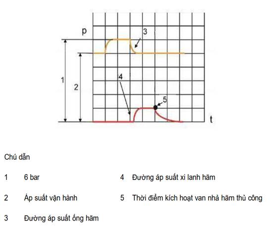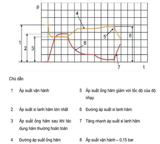 Chờ van hãm ổn định áp suất xi lanh hãm sau khi giảm áp ống hãm từ áp suất vận hành tối thiểu 0,3 bar với tốc độ giảm 0,6 bar trong 6 s. Quá trình tăng áp suất xi lanh hãm phải bắt đầu sau tối đa 3 s từ thời điểm áp suất ống hãm bắt đầu giảm.