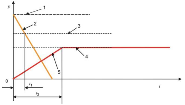 Quá trình hãm do tác động làm giảm áp suất ống hãm nhanh nhất để đạt được giá trị áp suất xi lanh hãm lớn nhất trong thời gian nhỏ nhất. Thời gian giảm áp suất ống hãm từ giá trị áp suất vận hành xuống mức cần thiết (t1) nhỏ hơn thời gian đạt được áp suất xi lanh hãm lớn nhất (t2). Quá trình được minh họa tại Hình 4.