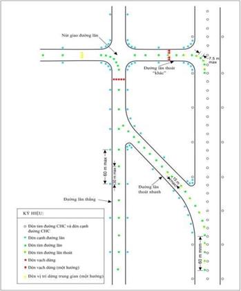 C.3.15. Tại nút giao đường lăn, biển báo sẽ được đặt trước điểm giao nhau và cùng hàng với sơn tín hiệu đường lăn giao nhau. Khi không có vạch sơn tín hiệu đường lăn giao nhau, biển báo sẽ được lắp đặt cách tim của đường lăn giao nhau tối thiểu 60m khi mã số là 3 hoặc 4, tối thiểu 40m khi mã số là 1 hoặc 2.