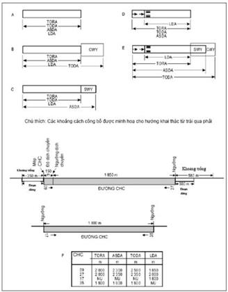 - Dải bay, khu vực an toàn cuối đường cất hạ cánh, đoạn dừng: chiều dài, chiều rộng làm tròn đến mét gần nhất, loại bề mặt;