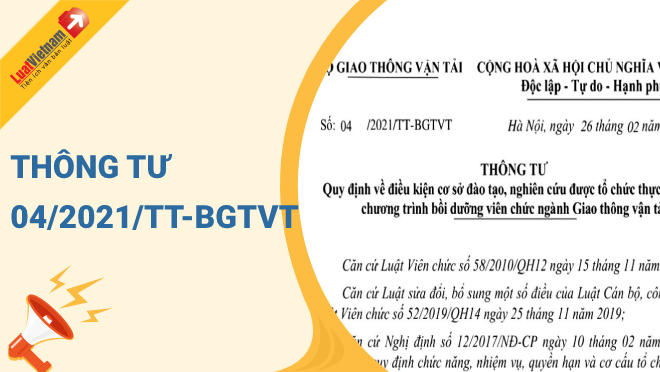 Ngày 26/02/2021, Bộ Giao thông Vận tải đã ban hành Thông tư 04/2021/TT-BGTVT về việc quy định về điều kiện cơ sở đào tạo, nghiên cứu được tổ chức thực hiện các chương trình bồi dưỡng viên chức ngành Giao thông Vận tải.