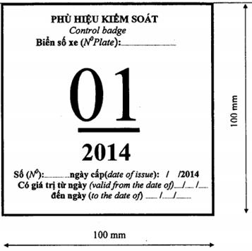 Ghi chú: 1. Kích thước của Phù hiệu: 100 mm x 100 mm 2. Biển số xe: ghi biển số đăng ký xe (Ví dụ: 74LB - 000.17) 3. Chữ số 01: là tháng; chữ số 2014 là năm cấp Phù hiệu kiểm soát 4. Từ ngày …. đến ngày …: Ghi thời hạn được phép hoạt động trong nội địa 5. Số: … ngày cấp: / /2014: Số….: ghi theo số thứ tự cấp Phù hiệu trong năm. 6. Màu sắc của Phù hiệu: nền trắng, chữ và số màu đen. 7. Đóng dấu treo của cơ quan cấp Phù hiệu kiểm soát vào giữa hàng chữ “Phù hiệu kiểm soát”. |