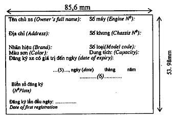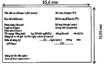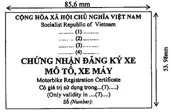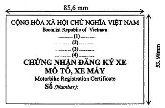Chứng nhận đăng ký xe mô tô, xe máy kích thước 85,6 x 53,98 mm được in trên nền giấy màu xanh, hoa văn hình Công an hiệu |