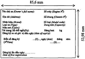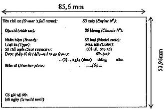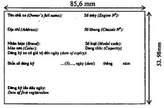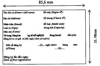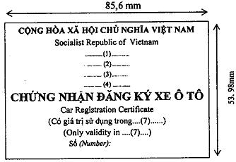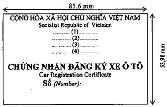 Chứng nhận đăng ký xe ô tô kích thước 85,6 x 53,98 mm được in trên nền giấy màu xanh, hoa văn hình Công an hiệu |