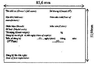 Chứng nhận đăng ký xe tạm thời kích thước 85,6 x 53,98 mm được in trên nền giấy màu xanh, hoa văn hình Công an hiệu |