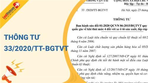 Ngày 23/12/2020, Bộ Giao thông Vận tải đã ra Thông tư 33/2020/TT-BGTVT về việc ban hành sửa đổi 01:2020 QCVN 86:2015/BGTVT Quy chuẩn kỹ thuật quốc gia về khí thải mức 4 đối với xe ô tô sản xuất, lắp ráp và nhập khẩu mới.