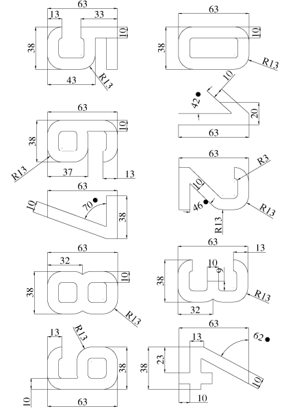 - Ở hàng trên: khoảng cách giữa các chữ và số là 5mm: trường hợp ở hàng trên có chứa số 1 thì khoảng cách giữa số 1 và chữ, số bên cạnh là 9mm, khoảng cách giữa 2 số 1 cạnh nhau là 13mm (khoảng cách giữa 2 nét chính là 20mm)
