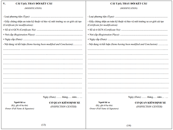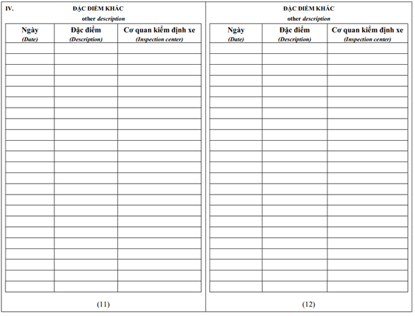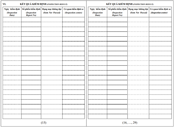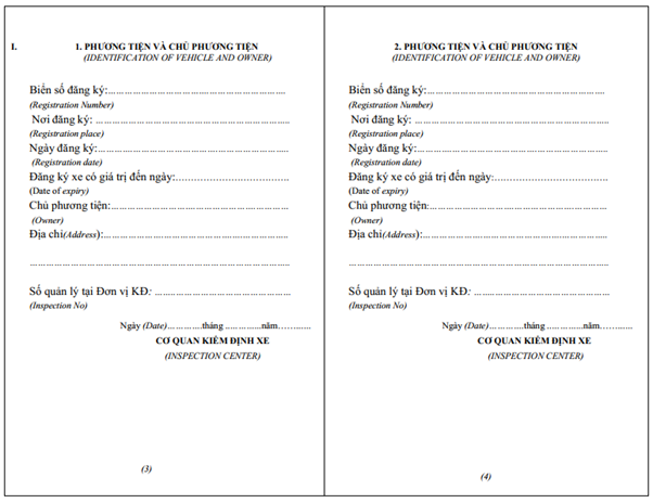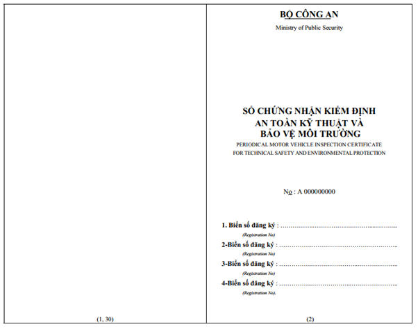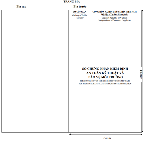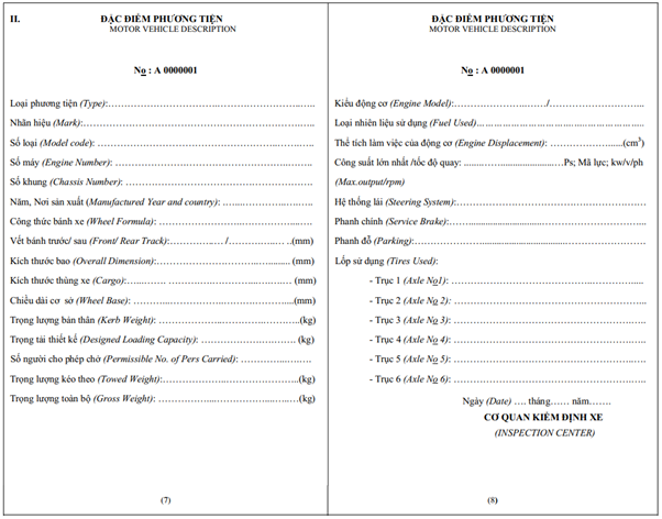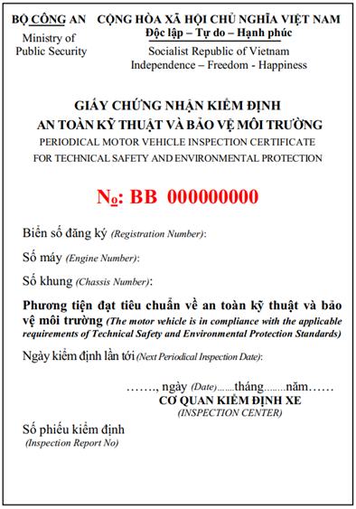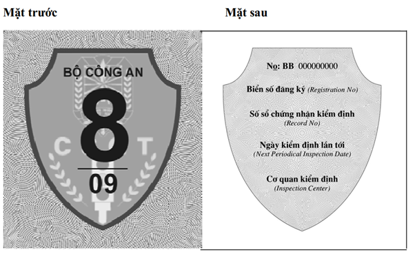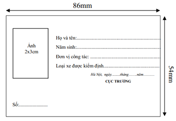 - Mặt sau: Nền màu trắng, chữ màu đen. Phía bên trái có hình chữ nhật để dán ảnh (cỡ 2x3cm); từ trên xuống dưới gồm các thông tin: họ và tên; sinh năm; đơn vị công tác; loại xe được kiểm định; Hà Nội, ngày, tháng, năm; Cục trưởng; Số.