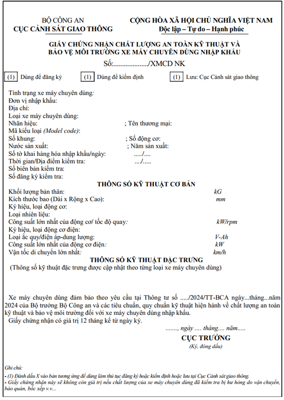 Thông tư 82/2024/TT-BCA chứng nhận an toàn kỹ thuật và bảo vệ môi trường xe cơ giới trong nhập khẩu, sản xuất, lắp ráp