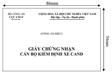 - Mặt trước: Nền màu đỏ, Chữ màu vàng. phía trên bên trái có hàng chữ BỘ CÔNG AN, CỤC CSGT; phía trên bên phải có hàng chữ: Cộng hoà xã hội chủ nghĩa Việt Nam; Độc lập - Tự do - Hạnh phúc; ở giữa in hình Công an hiệu; dưới cùng là hàng chữ: GIẤY CHỨNG NHẬN CÁN BỘ KIỂM ĐỊNH XE CAND.