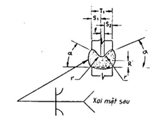 2.2.1.3. Chiều sâu hiệu dụng của mối hàn vát mép ngấu không hoàn toàn được tính như sau: Nếu góc vát nhỏ hơn 60° thì chiều sâu hiệu dụng mối hàn bằng chiều sâu mép vát S trừ 3mm đối với mọi tư thế hàn. Nếu góc vát lớn hơn hoặc bằng 60° khi hàn ở tư thế hàn bằng hoặc hàn ngang thì chiều sâu hiệu dụng mối hàn bằng chiều sâu mép vát S. Còn khi hàn ở tư thế đứng hoặc hàn trần thì bằng chiều sâu mép vát S trừ đi 3mm.