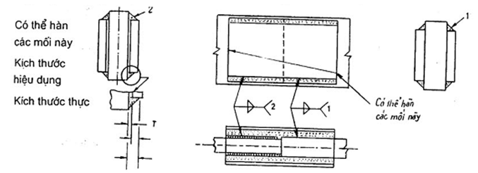 2.3.1. Các bản hàn đệm (Hình 2.1) được xếp loại kém khi xét ảnh hưởng của hình dáng kết cấu đến độ bền mỏi và không được sử dụng cho các nhân tố chịu kéo và chịu tải trọng lặp. Nó được dùng để nối các bản có chiều dày khác nhau hoặc khắc phục sự sắp xếp hình học hiện có cho mối nối mới bằng cách hàn đệm.