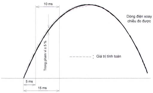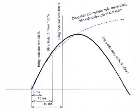 - Dạng sóng của dòng điện thử nghiệm phải bằng hoặc lớn hơn 95 % giá trị dòng điện thử nghiệm ngắn mạch bằng điện một chiều (giá trị tính toán) tại 5 ms sau khi xảy ra ngắn mạch.