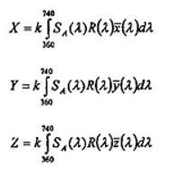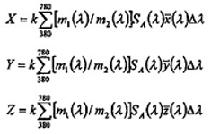 , nguồn sáng S(λ) và tỷ lệ lượng phản quang R(λ) được sử dụng cùng nhau để tính toán giá trị cặp ba X, Y và Z như sau: