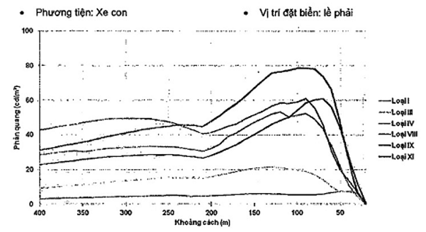 Hình E.3: Độ phản quang của biển báo đặt bên lề phải đối với xe con