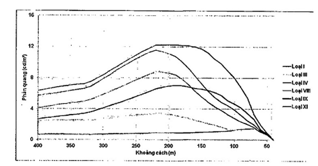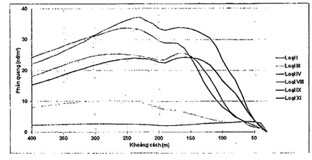 Lượng ánh sáng phản chiếu đến người lái xe từ đèn chiếu gần và đèn chiếu xa cho các loại màng phản quang (tham khảo tài liệu “A Market-Weighted Description of Low-Beam and High-Beam Headlighting”)