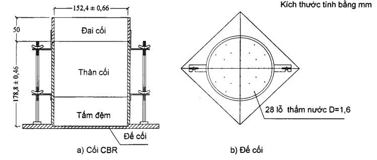 6.3.3 Đế cối là một tấm thép được khoét sâu với đường kính thích hợp (bằng đường kính ngoài của thân cối cộng thêm khoảng dung sai) để dễ cố định với thân cối khi lắp. Tại vùng khoét sâu được đục ít nhất 28 lỗ nhỏ đường kính 1,6 mm để nước dễ thấm vào mẫu khi ngâm mẫu trong nước.