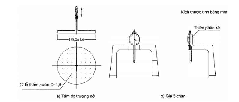 6.6.1 Tấm đo trương nở là một đĩa bằng đồng hình tròn đường kính (149,2 ± 1,6) mm, trên đĩa có đục ít nhất 42 lỗ nhỏ đường kính 1,6 mm, ở giữa đĩa có gắn một trục vuông góc với đĩa và có vít điều chỉnh được chiều cao của trục.