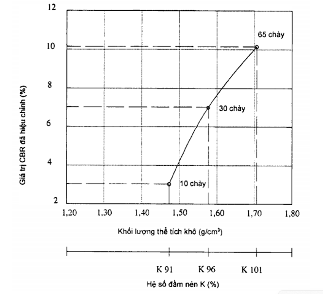 Căn cứ kết quả thí nghiệm (Hình B.3), có thể xác định được giới hạn khoảng độ ẩm đầm nén thích hợp để đạt được tỷ số CBR nhỏ nhất yêu cầu.