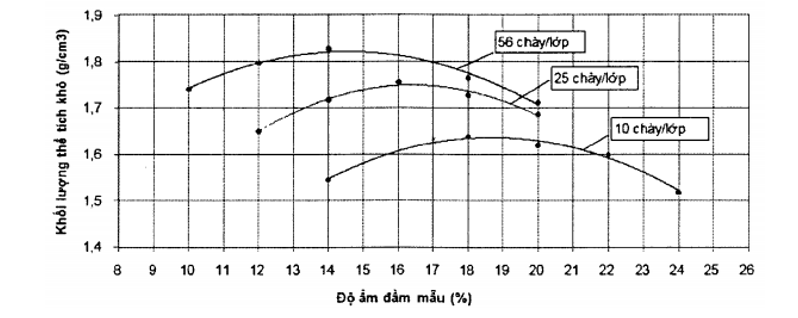 - Tiến hành đầm mẫu: mỗi mẫu được đầm với 56 chày/lớp. Việc đầm, xác định độ ẩm, khối lượng thể tích khô của các mẫu được thực hiện theo trình tự như mô tả tại Điều 7 của tiêu chuẩn, chỉ khác ở chỗ các mẫu này sẽ được đầm với 56 chày/lớp.