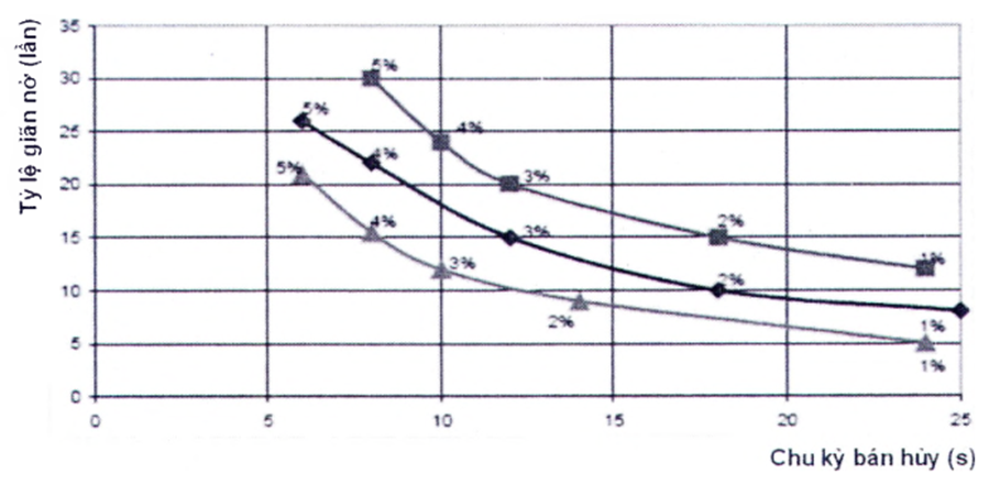 Hình B.2 - Ví dụ về sự giãn nở và chu kỳ bán hủy ở 3 nhiệt độ với hàm lượng nước từ 1 % đến 5 %