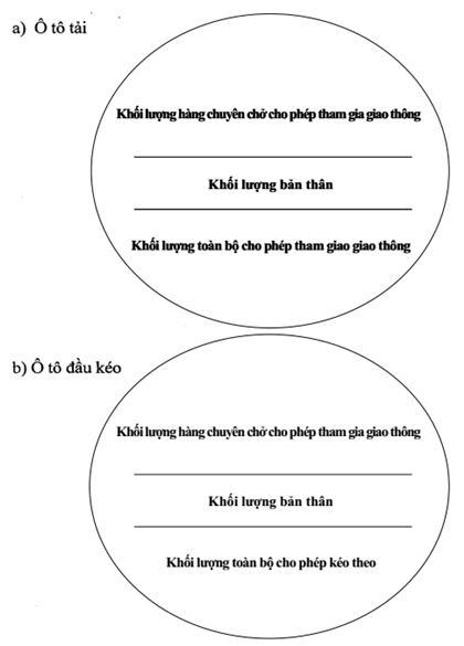 - Đối với ô tô đầu kéo: Khối lượng hàng chuyên chở cho phép tham gia giao thông (khối lượng toàn bộ của sơmi rơ moóc phân bố lên cơ cấu kéo), khối lượng bản thân, khối lượng toàn bộ cho phép kéo theo (đơn vị tính bằng tấn).