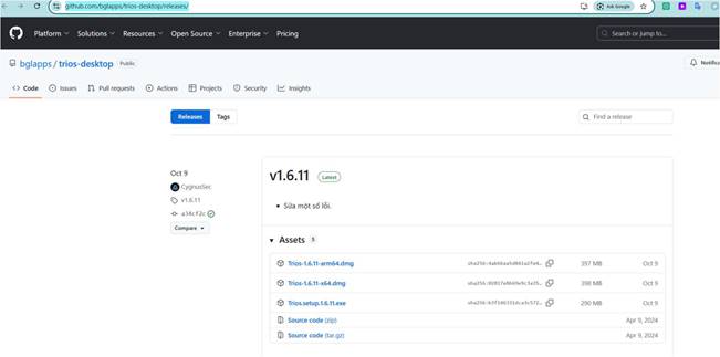 Bước 1. Để tải phần mềm, người dùng truy cập đường dẫn https://github.com/bglapps/trios-desktop/releases/ và chọn phiên bản cài đặt định dạng đuôi “.exe” mới nhất bên cạnh có chữ latest, ví dụ: