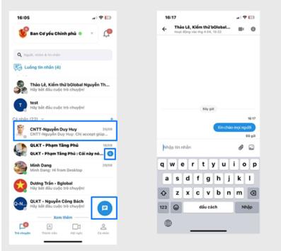 Bước 1. Tại màn hình danh sách, click biểu tượng [+] ở đầu danh sách hội thoại, hoặc chọn biểu tượng “Tin nhắn” ở dưới cùng màn hình app, tìm kiếm tên một người bạn muốn gửi tin.