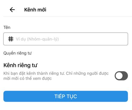 Nhập Tên kênh. Nếu tích tùy chọn “Kênh riêng tư”, chỉ những người nhận được lời mời mới có thể xem được. Chọn “tiếp tục” rồi và tích chọn Người dùng khác để thêm vào kênh để hoàn thiện