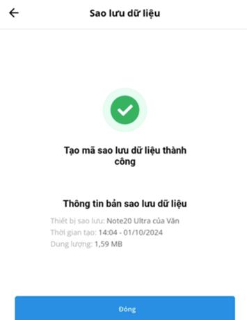 Bước 4. Sau khi tạo thành công, hệ thống hiển thị thông báo tạo mã sao lưu thành công và thông tin bản sao lưu (Bao gồm tên thiết bị sao lưu, thời gian tạo, dung lượng)