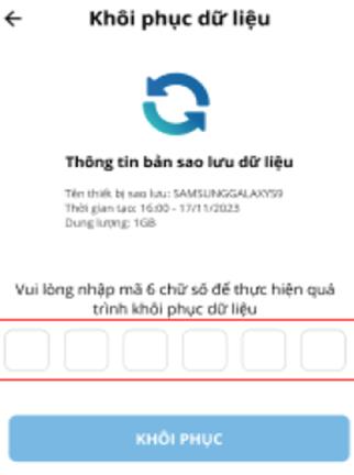 Bước 3. Thực hiện nhập mã sao lưu đã tạo trước đó (Gồm 6 chữ số). Sau khi nhập, hệ thống hiển thị giao diện khôi phục dữ liệu
