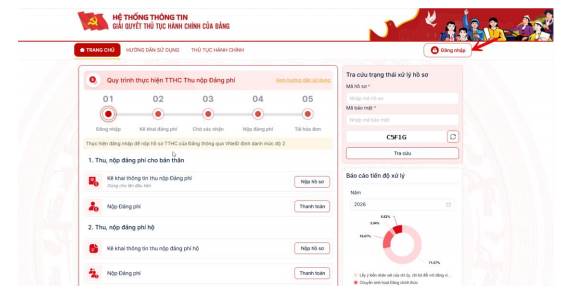 Bước 1: Đảng viên truy cập theo đường dẫn dichvucong.dcs.vn, đăng nhập tài khoản qua mức định danh cấp 2 VNeID để kiểm tra thông tin đảng viên.