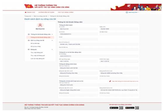 Bước 2: Đảng viên vào chức năng Cá nhân > Dịch vụ công của tôi > Thông tin tài khoản