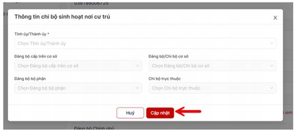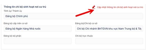 - Đảng viên xem thông tin chi bộ sinh hoạt nơi cư trú nếu chưa chính xác thì nhấn vào nút “Cập nhật thông tin chi bộ sinh hoạt nơi cư trú” để thực hiện cập nhật lại thông tin.