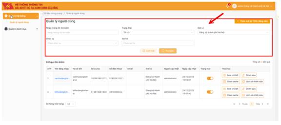 - Đơn vị: các đơn vị thuộc Tỉnh ủy/Thành ủy. Ví dụ chọn Đảng bộ phường Cầu Giấy sẽ hiển thị các tài khoản thuộc cơ quan đảng bộ phường Cầu Giấy