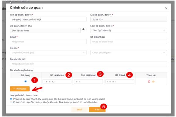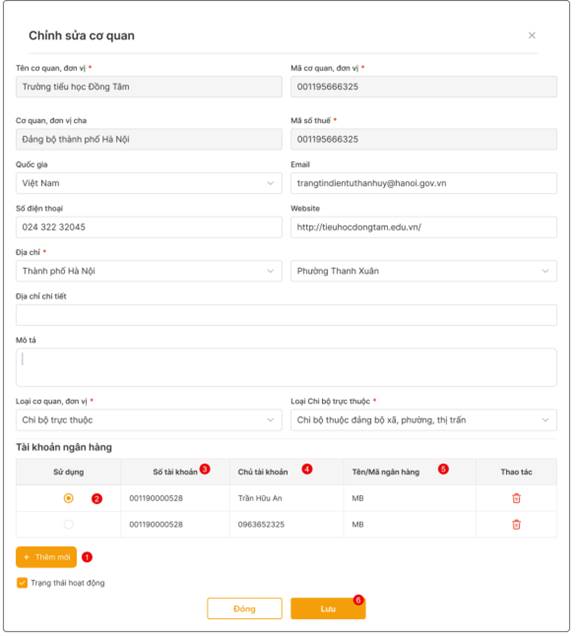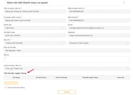 Đối với cấp cơ quan từ cấp đảng bộ - chi bộ, admin thực hiện rà soát các tài khoản của các cơ quan đó bằng cách vào Xem chi tiết thông tin các cơ quan cấp đảng bộ - chi bộ. Nếu chưa có tài khoản ngân hàng, thực hiện thêm tài khoản ngân hàng cho các cơ quan đó (thao tác như mục 2.2.2)