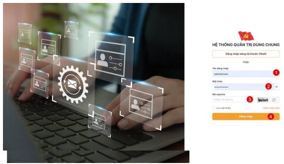 Cán bộ nhập tên đăng nhập, mật khẩu, mã captcha và nhấn nút “Đăng nhập” để truy cập vào hệ thống.