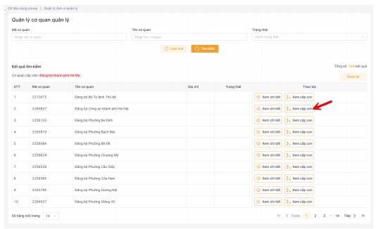 Admin muốn xem tất cả các cơ quan cấp con đến cấp Đảng bộ bộ phận/ Chi bộ trực thuộc thì nhấn tiếp