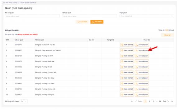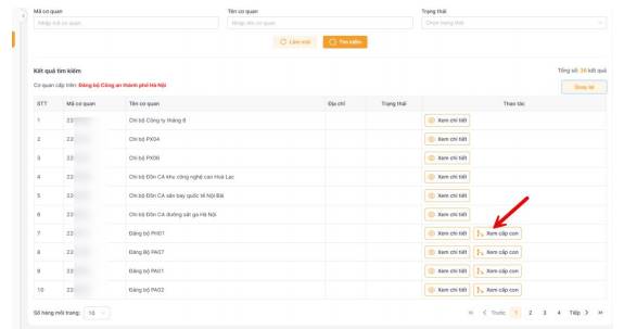 Bước 5: Xem danh sách cơ quan Chi bộ trực thuộc Tại cấp Đảng bộ/Chi bộ cơ sở, nhấn “Xem cấp dưới”