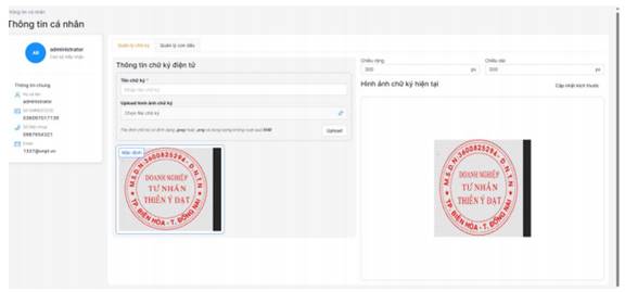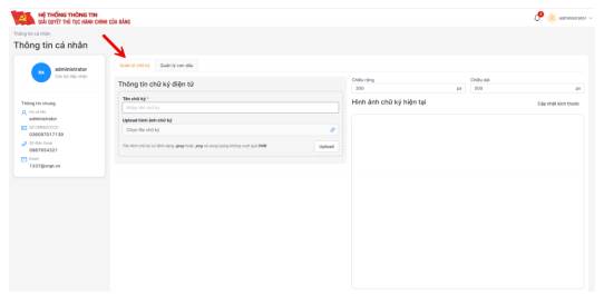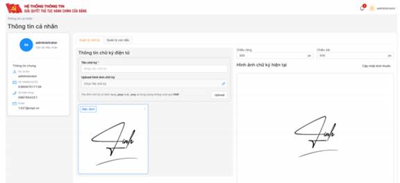 Cán bộ nhấn nút Upload, màn hình cập nhật và hiển thị chữ ký số cán bộ mới cập nhật.